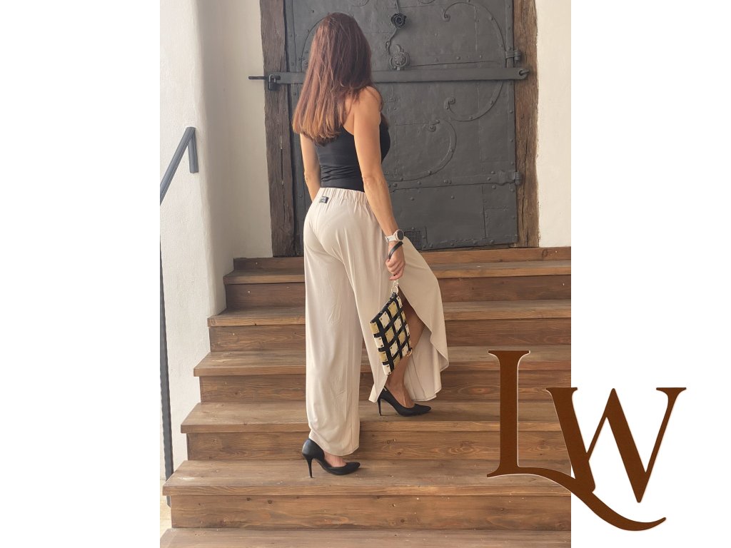 Letné ľahké nohavice s rásporkom po bokoch. Ručne šité na Slovensku